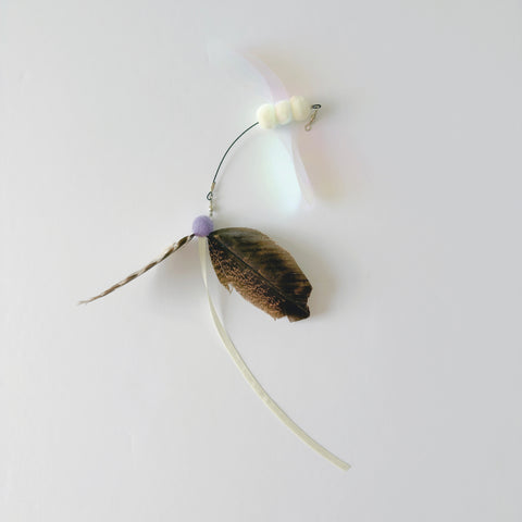 Velum is a lightweight hanging toy designed with soft feathers and a long ribbon tail to create slow, vertical movement. The wings respond to small air currents and light touches, encouraging batting, jumping, and upward tracking.