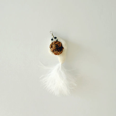 Ghostie is a lightweight hanging toy made with a soft plush body and a feather tail that moves with light air and touch. The dangling design encourages batting, grabbing, and jumping during vertical play.